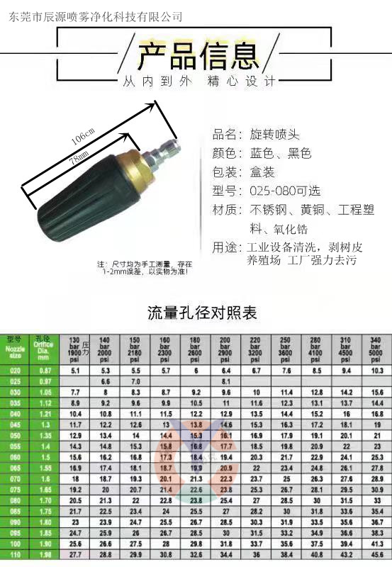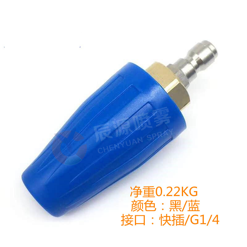 辰源的高压旋转喷头是一款专业冲洗喷嘴,专为高压、高冲击汽车清洗而设计。其基于专业的结构设计,在60公斤压力下,可爆发出一条零度直线水流,在腔内水涡流的驱动下,实现每分钟1500-2500次高速旋转,形成24度锥形圆圈,冲击强劲,相比普通喷嘴压力大,冲洗效果好。 高压旋转喷头因其更强的冲击力,可以使用小流量型号即可以获得与大流量普通喷嘴相同的冲洗效果,从而实现节约用水。